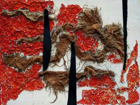 Carta, sacco di juta, carta stagnola e acrilico su compensato.