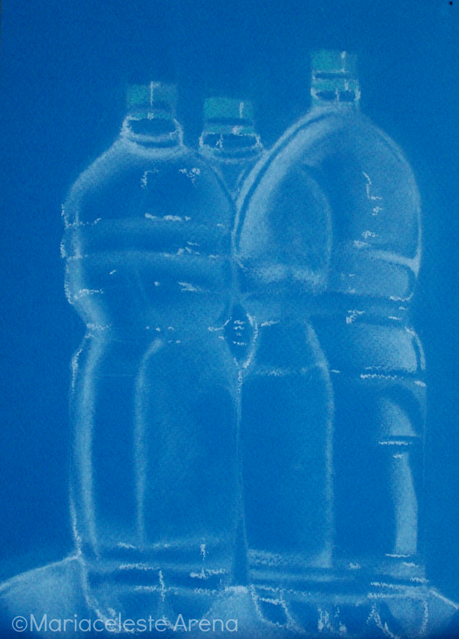Pagina FB: https://www.facebook.com/mariacelestearena/ Composizione di bottiglie realizzate con crete bianche su foglio ruvido azzurro A4