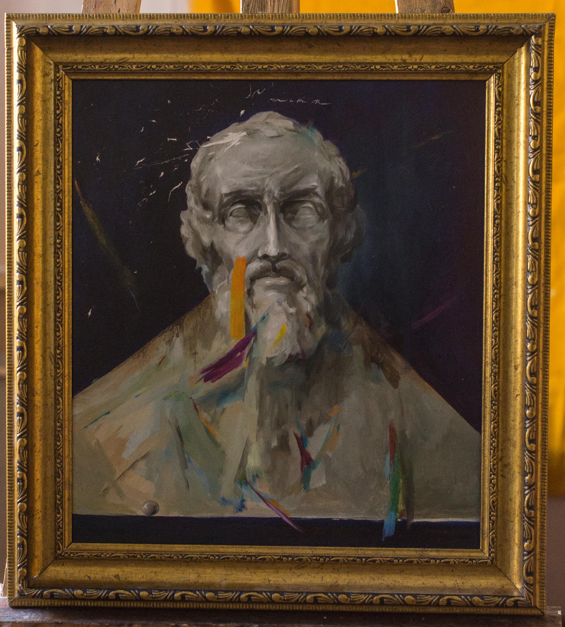 Herodot,father of the history is rissing in a line with the Gods above the chaos that is not having begining and an ending. He is glorified above the material things,because glass ball is signify ripeness and goddess intelligence that belongs just to his mind. .