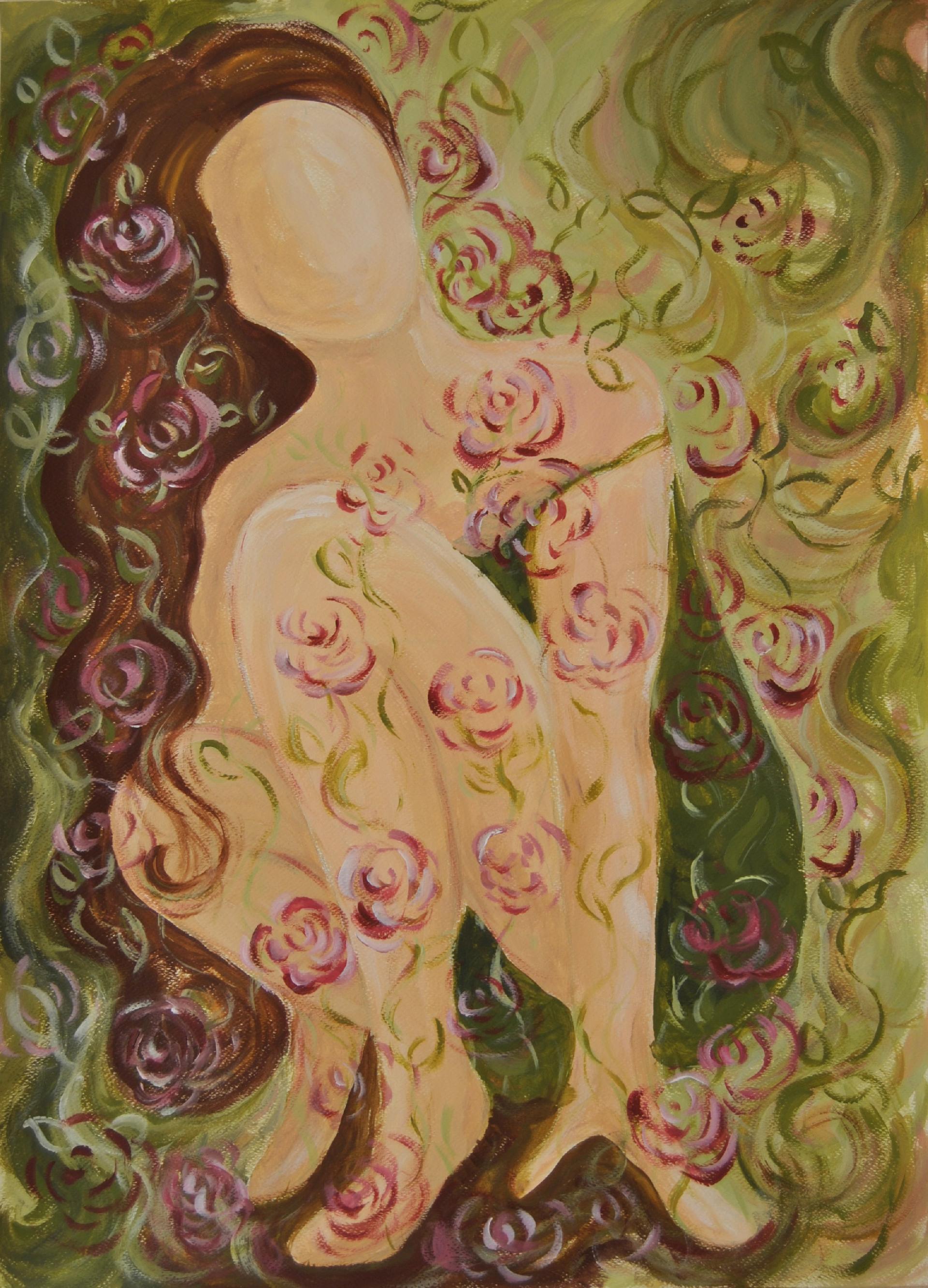 Una figura femminile dalle forme sinuose padroneggia la scena. La morbidezza del segno pittorico e della cascata di capelli sembrano unirsi, in una sorta di metamorfosi, agli elementi naturali; rose e foglie in trasparenza avvolgono la donna e finiscono per fondersi nell'astratto dello sfondo. Un'immagine in cui la figura e gli elementi naturali convivono in un gioco di intrecci e relazioni cromatiche . acrilico su cartoncino
