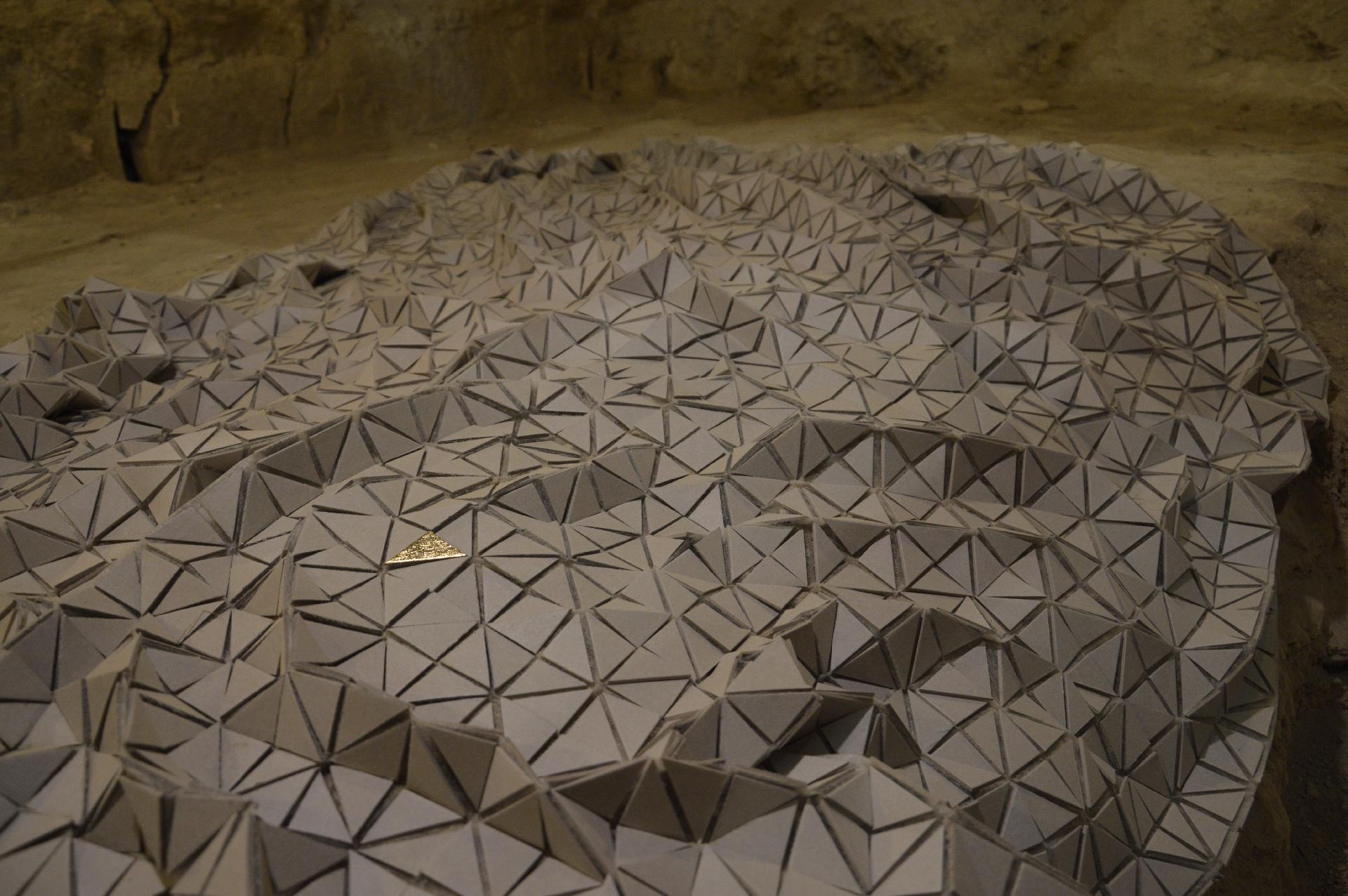 FORMLESS è un'installazione che si presenta come tentativo di riscoperta e rivalutazione di una superficie. L'obbiettivo è quello di coprire una superficie nell'atto di costruire e nello stesso tempo svelare, ricalcando, forme già esistenti recuperando, rinnovando e riutillizando il profilo esistente della superficie appena coperta. In questa azione il disegno che si va a sovrapporre a una superficie, ne acquisterà le caratteristiche, sottolineandone le forme e contemporaneamente generandone di nuove. Il disegno stesso si realizza come costruzione disponendo triangoli di tre centimetri, in una griglia di costruzione che si estende su tutta la superficie ed è quella grazie al quale il tessuto può modularsi nello spazio, piegandosi avvolgendo una superficie e conquistando lo spazio che lo circonda diventando essa stessa una costruzione. Quest'installazione non esiste se non nel contesto della sua esposizione, è senza forma, e si realizza solo all'interno di uno spazio, si modella su di esso, si trasforma in esso. Esaurisce la sua funzione in questo e dopo ne costituisce la traccia e la sua memoria. . mixed media (tessuto cartone e foglia d'oro)