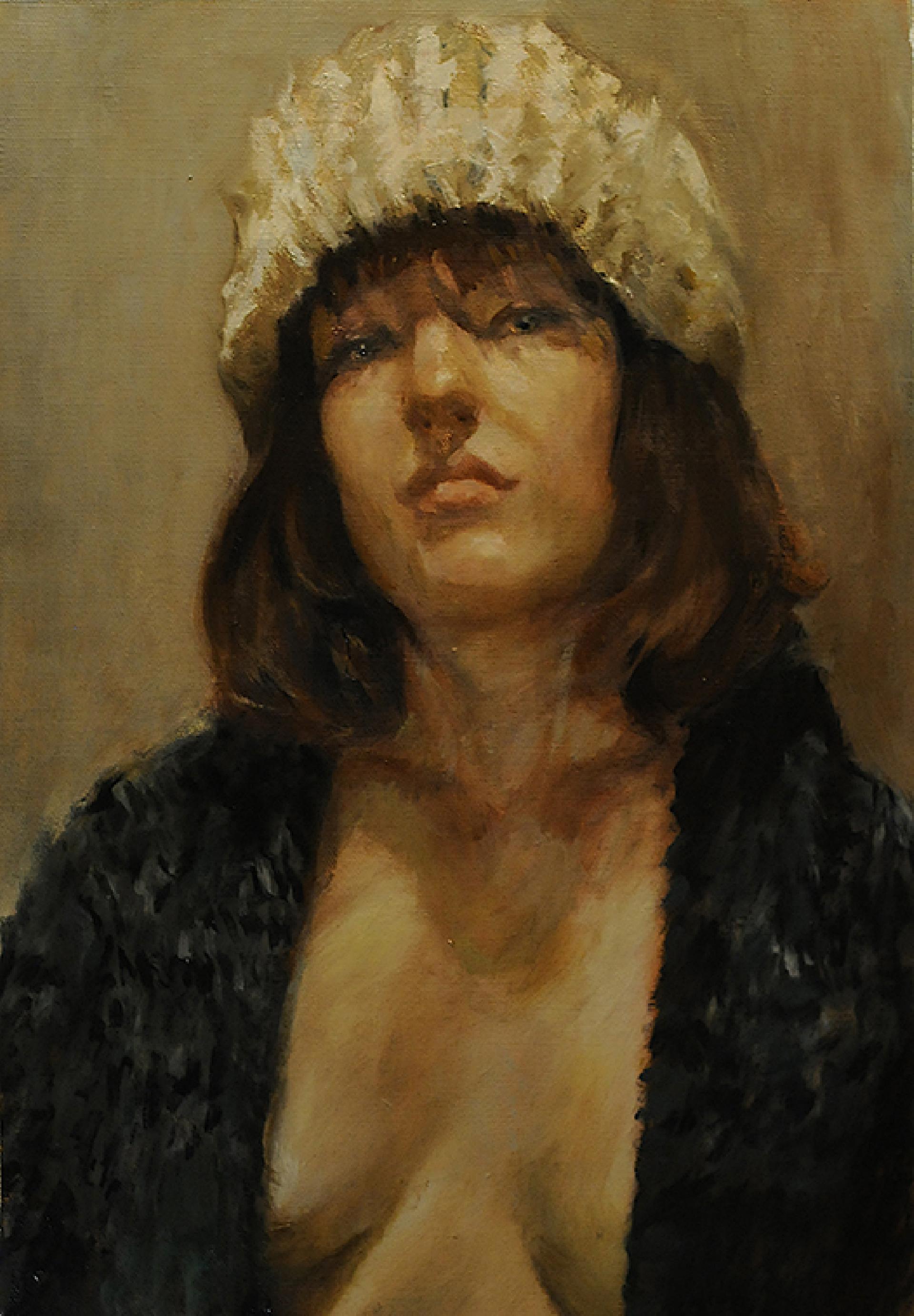 L'interesse è rivolto particolarmente allo sguardo della modella nascosto nell'ombra proiettata dal copricapo. L'inquadratura dal basso amplifica l'espressione indagatrice della giovane donna. olio su tela
