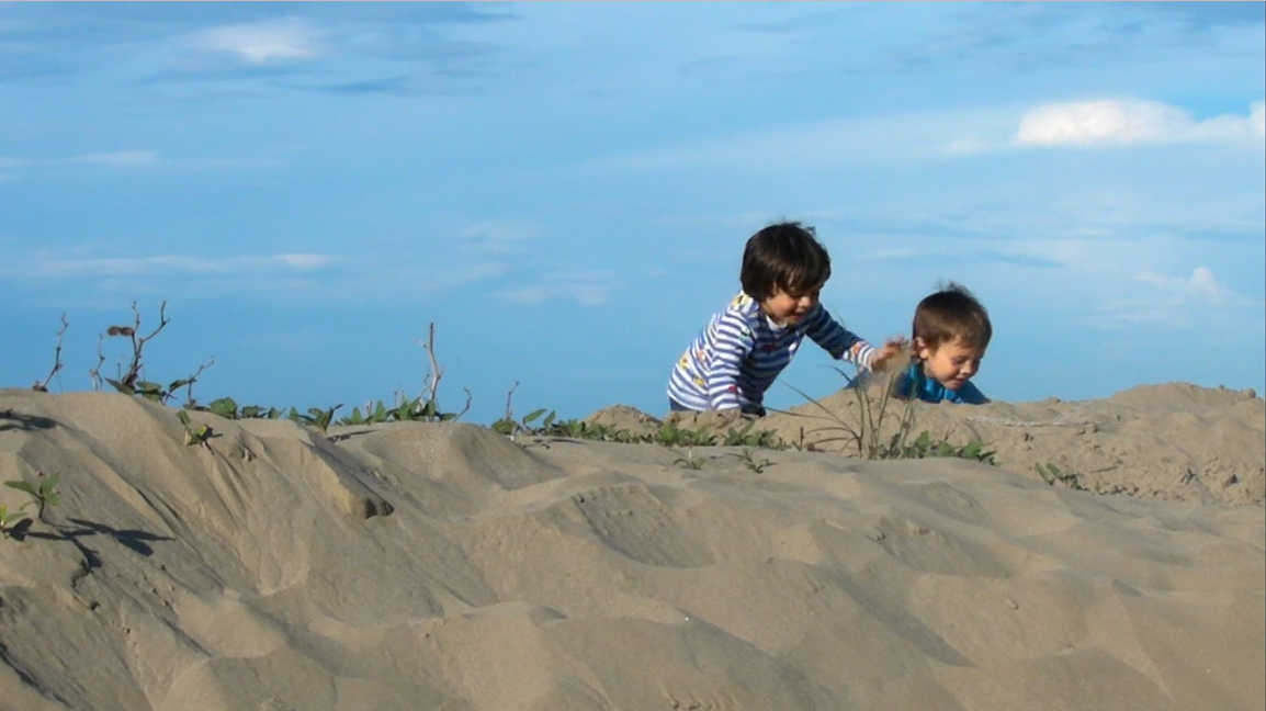 Francesco e Tommaso giocano continuando a ripetere la stessa azione: salgono e scendono a corse la duna di sabbia.
