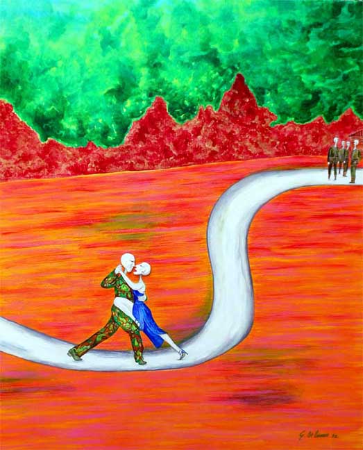 Un uomo in tuta mimetica che balla con una donna molto elegante lungo un tortuoso sentiero di campagna e alcune soldatesse sullo sfondo, anche loro in divisa militare, che guardano questa coppia mentre volteggia in armoniosi passi di danza. Ma è la danza della morte: l'uomo è Parolisi e la donna è sua moglie Melania. L'argomento di quest'opera è quindi il famoso fatto di cronaca nera che tutti conosciamo. L'artista però ha voluto rendere romantico l'ultimo incontro tra marito e moglie, ha voluto trasfigurarlo in un tango passionale, nonostante i macabri dettagli propagandati dai mass media. Un'altra presenza importante in questa fantastica interpretazione dei fatti è la natura. Anche lei sta a guardare, muta. Un bosco fitto e misterioso che conosce tanti segreti, silenzioso testimone di sordidi traffici. Ma è primavera, le sue foglie stanno rinverdendo e il colore della speranza sembra accogliere Melania tra le sue braccia.