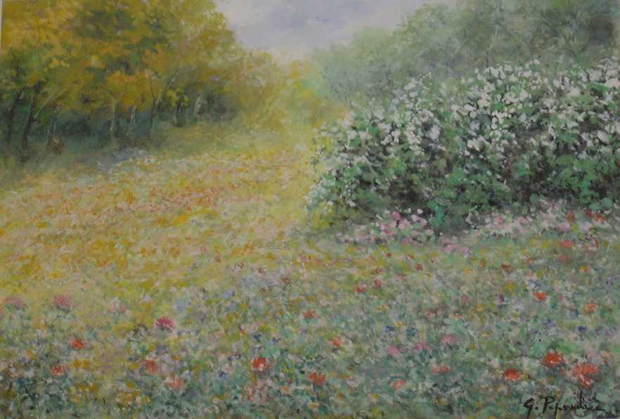 Una veduta di campagna con il prato fiorito,con arbusti e con alberi.