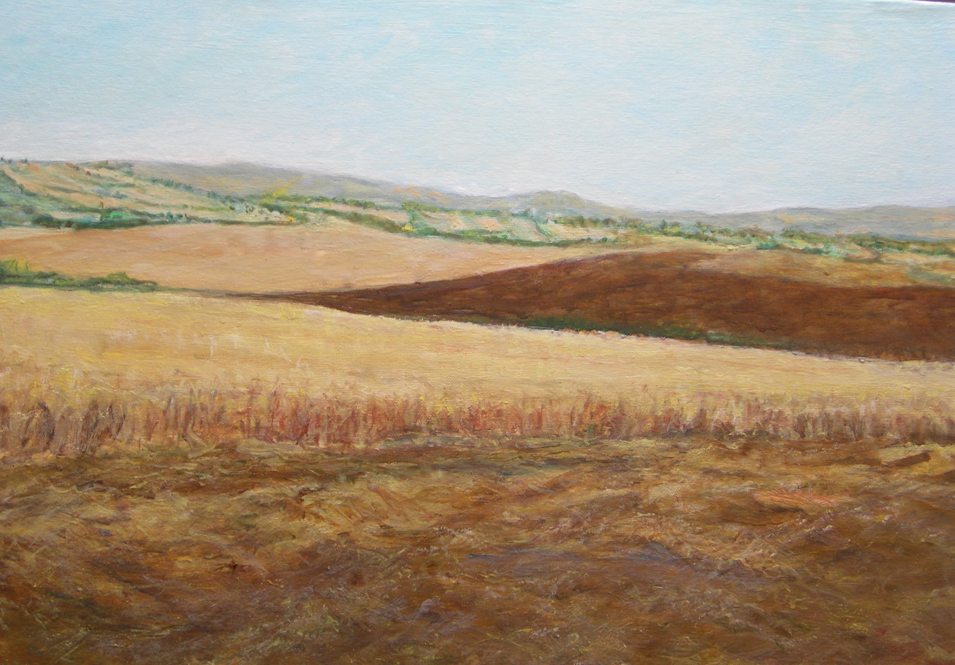 Rappresentazione paesaggistica delle zone rurali campidanesi, articolata su piani pittorici differenziati, in rapporto alla morfologia del territorio, che nel contesto dell'opera danno l'idea di forme geometriche naturali.