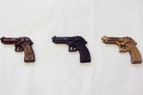 Tre pistole in bronzo, ferro ed oro simboleggiano il progresso della civilità umana, da sempre caratterizzato dalle guerre. La violenza, e non la cultura, è